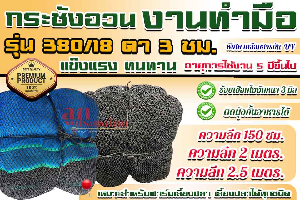 รุ่น อวน 380/18 ตา 3 ซม. [ เกรดพรีเมี่ยม ] ความลึก 150 ซม. |